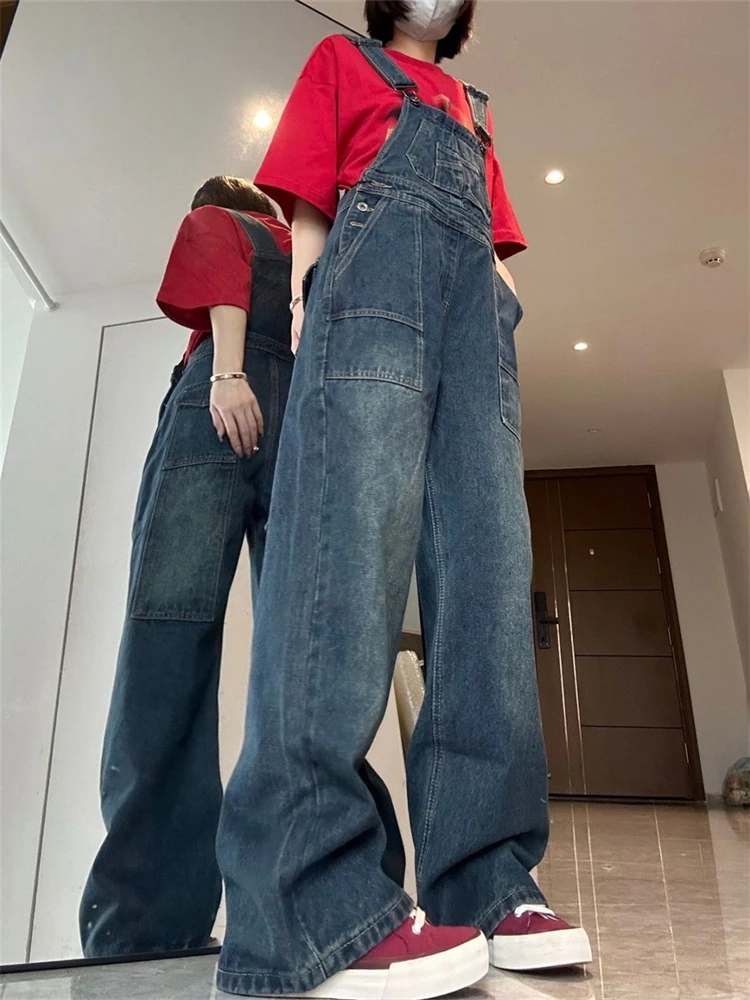 Women's Vintage Suspender Jumpsuit Wide Leg Pants Young Girl Academic Style Rompers Female Retro Casual Straight Denim Trouser