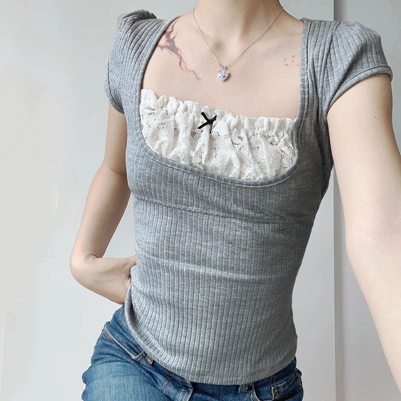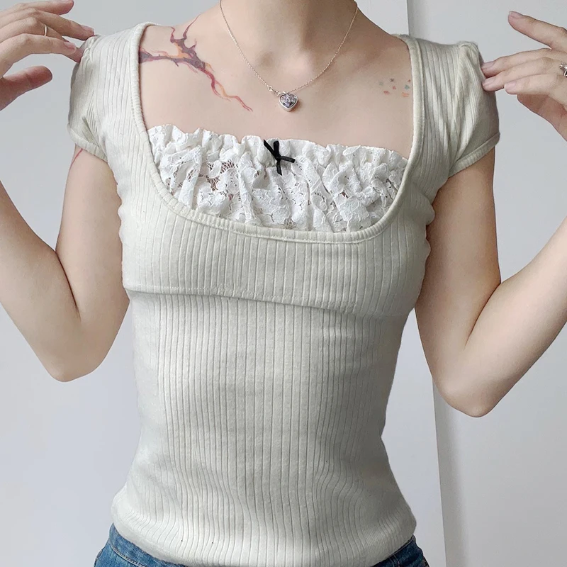 Y2K Contrast Lace Patchwork Knitted Top Women Cute Casual Basic Short Sleeve T-shirts Summer Coquette Square Collar Tee