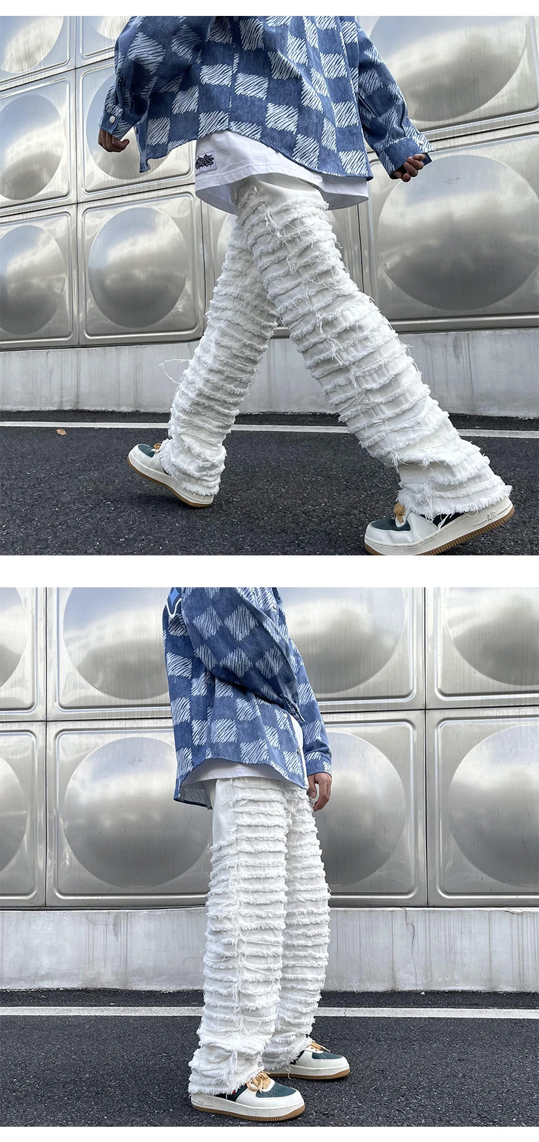 White Hip Hop Jeans Striped Tassel Frayed Straight Baggy Jeans Pants Harajuku Male Female Solid Streetwear Casual Denim Trousers voguable