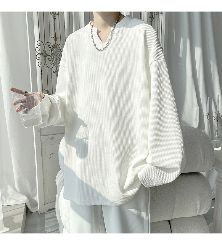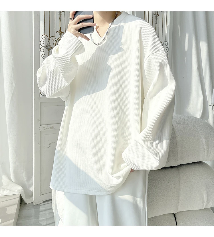 White Long Sleeved T-shirt Men Oversized Casual V-neck T Shirt Men Streetwear Korean Loose Pleated T Shirt Mens Top M-3XL