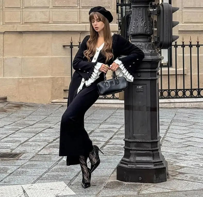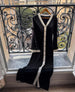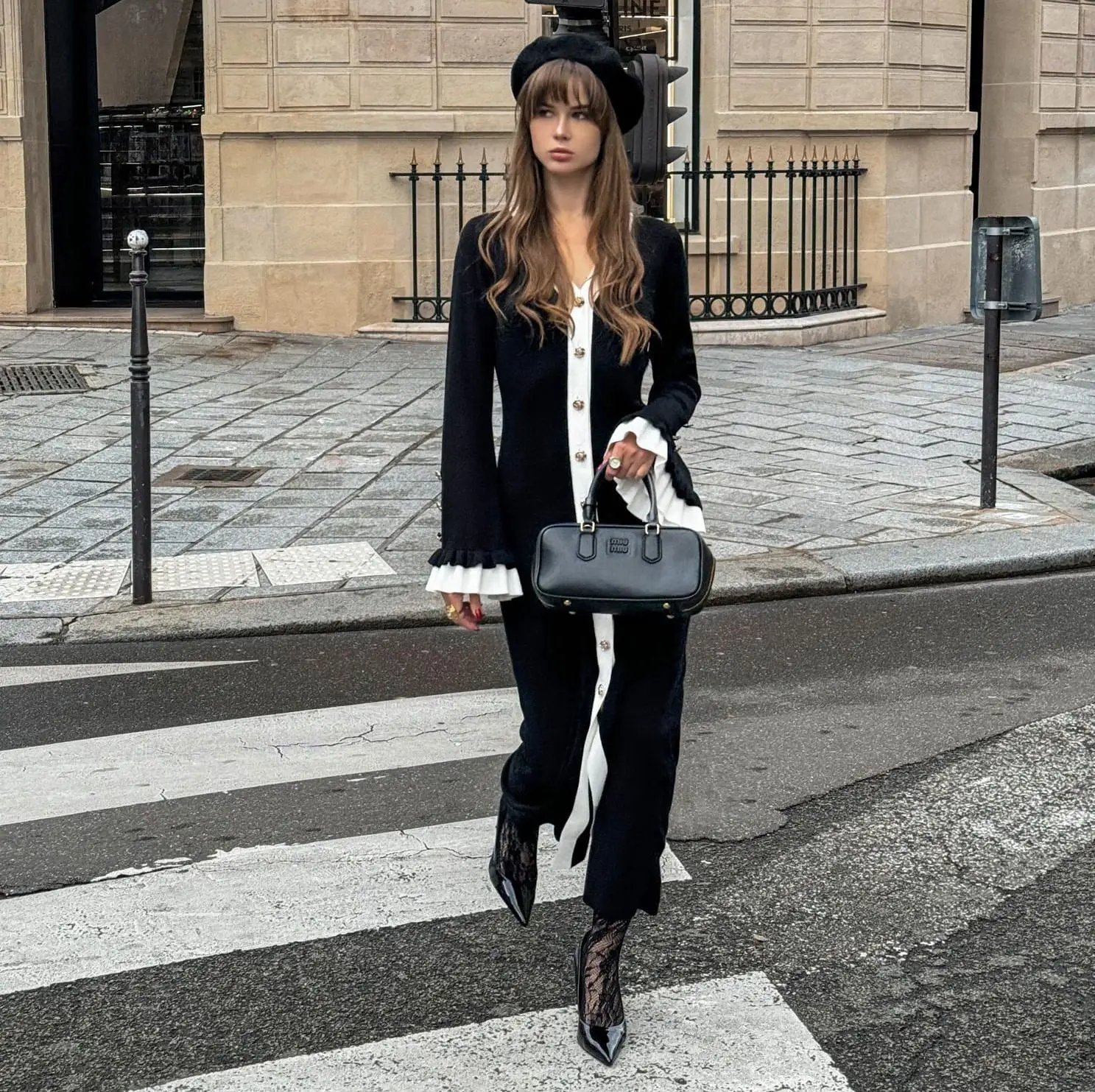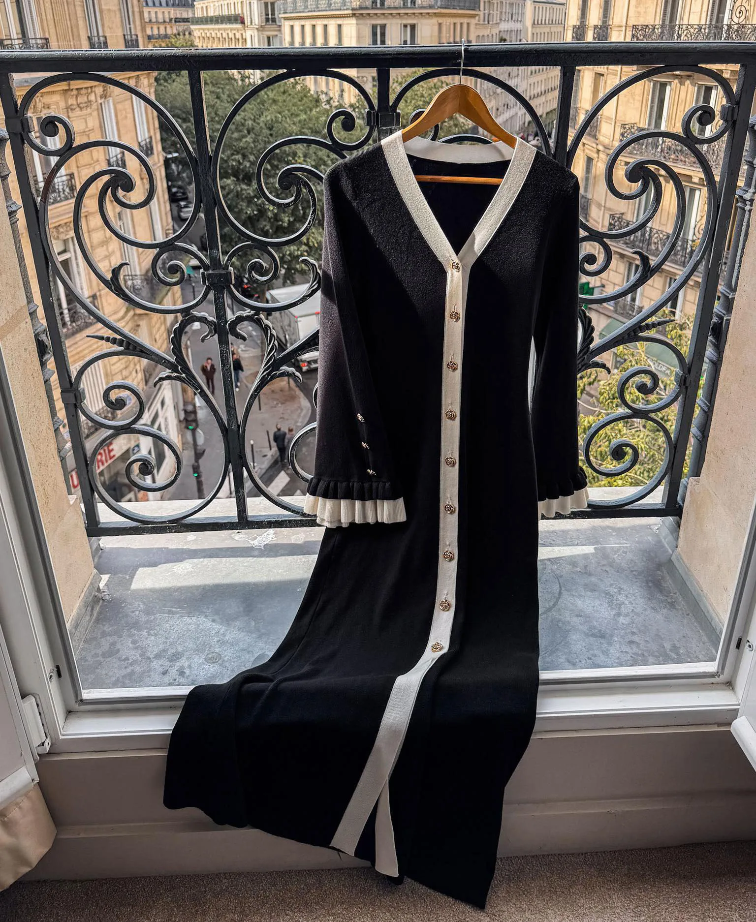 Winter Autumn Single Breated Elegant Knit Dress V-neck Flare Sleeve Patchwork Black Women Dress Chic Fashion Woman Cloting
