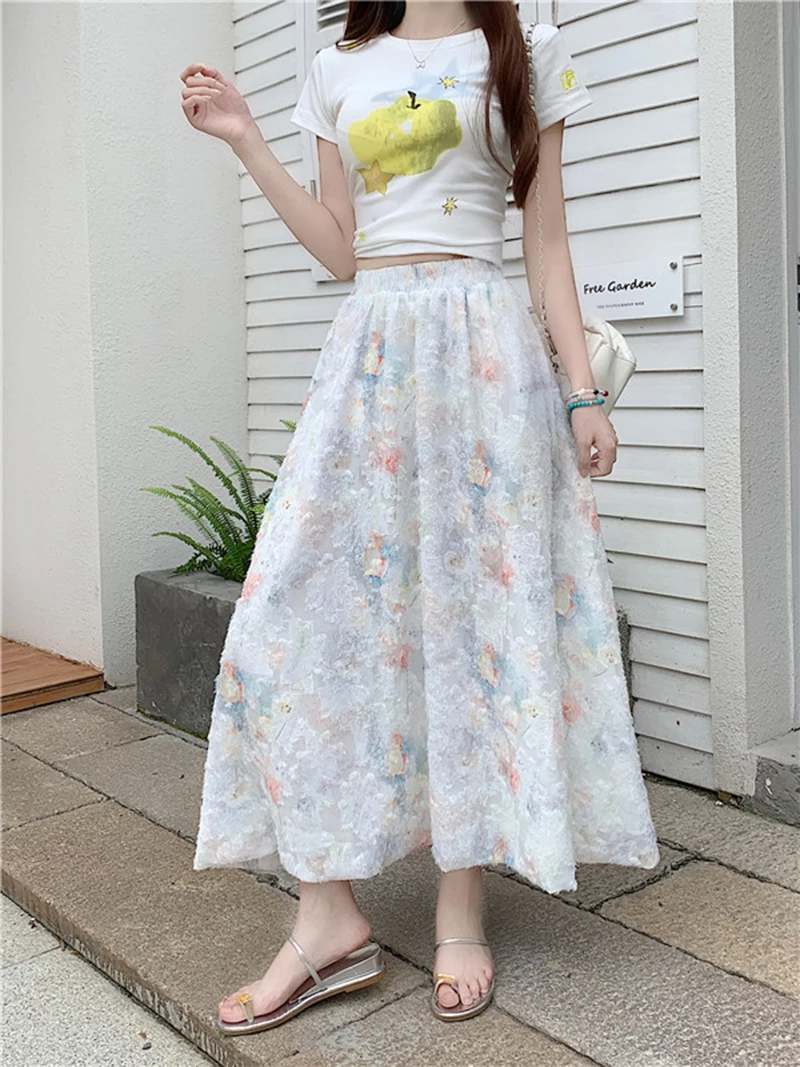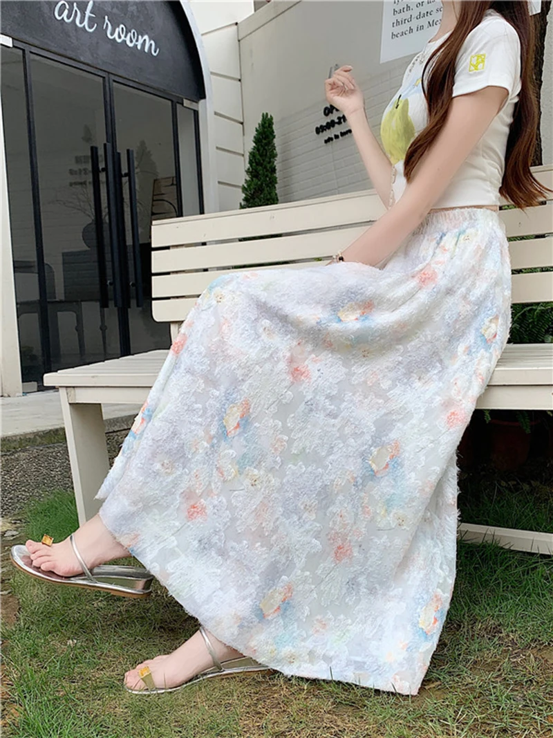 Women Floral Sweet Long Skirt Casual High Waist Elegant Loose Korean Skirts High Quality Lady Fashion Ball Gown Long Skirts