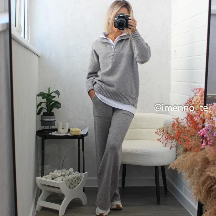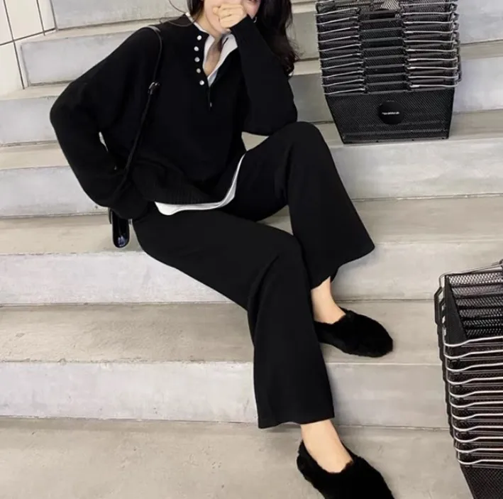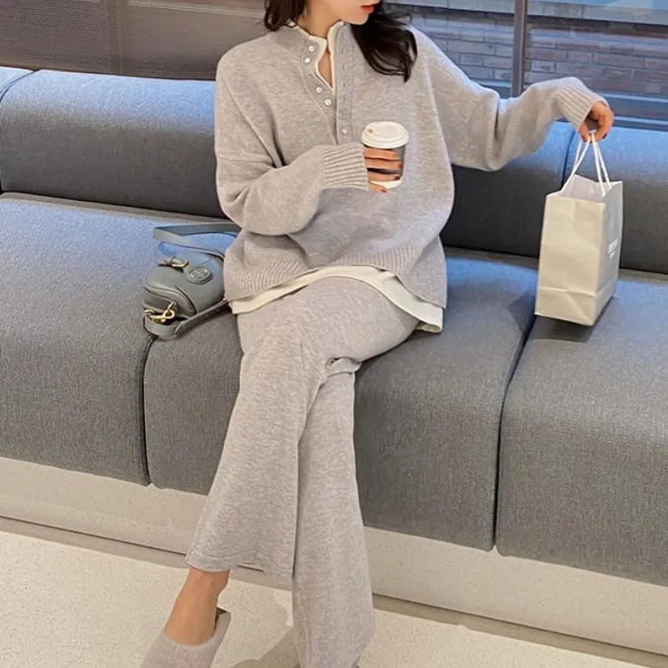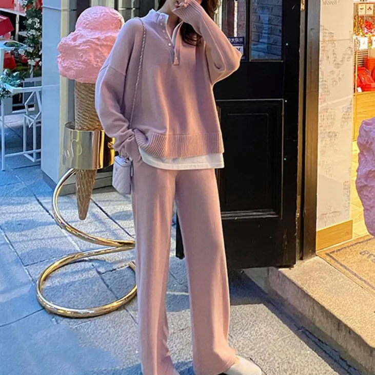 Women Knitted Sweater Sexy Two Piece Sets New Autumn Winter Warm Casual Long Sleeve Pullovers Wide Leg Pants Ladies Suits