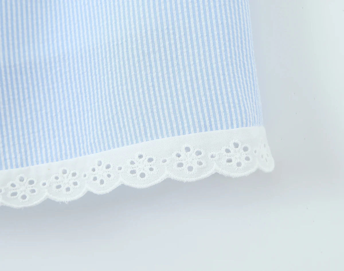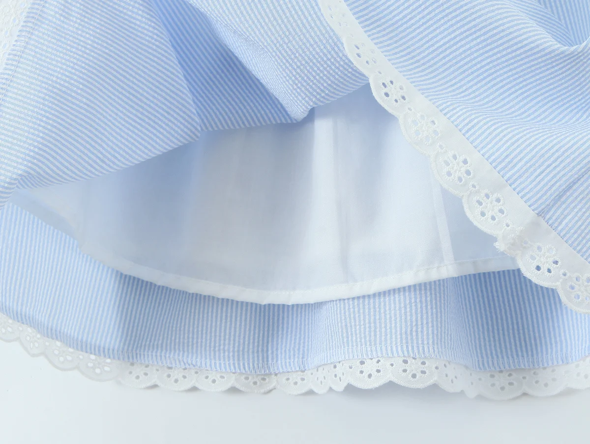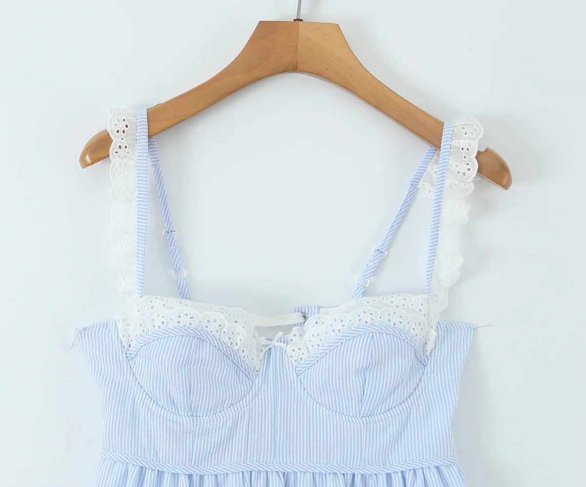 2025 Women Lace Spliced Blue Striped Sling Short Dress