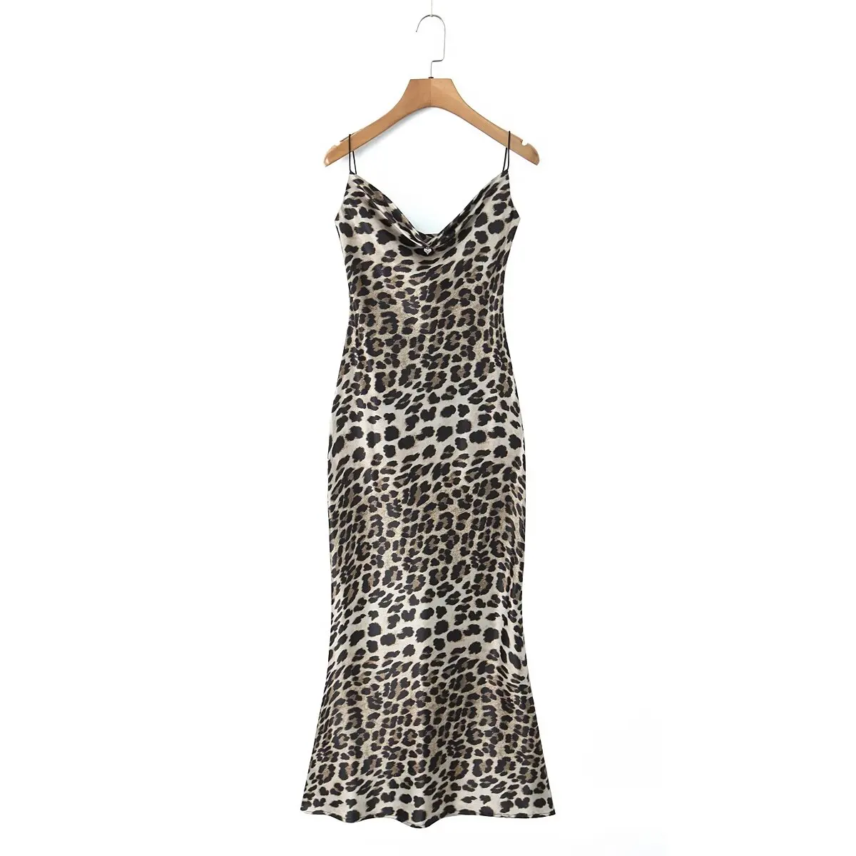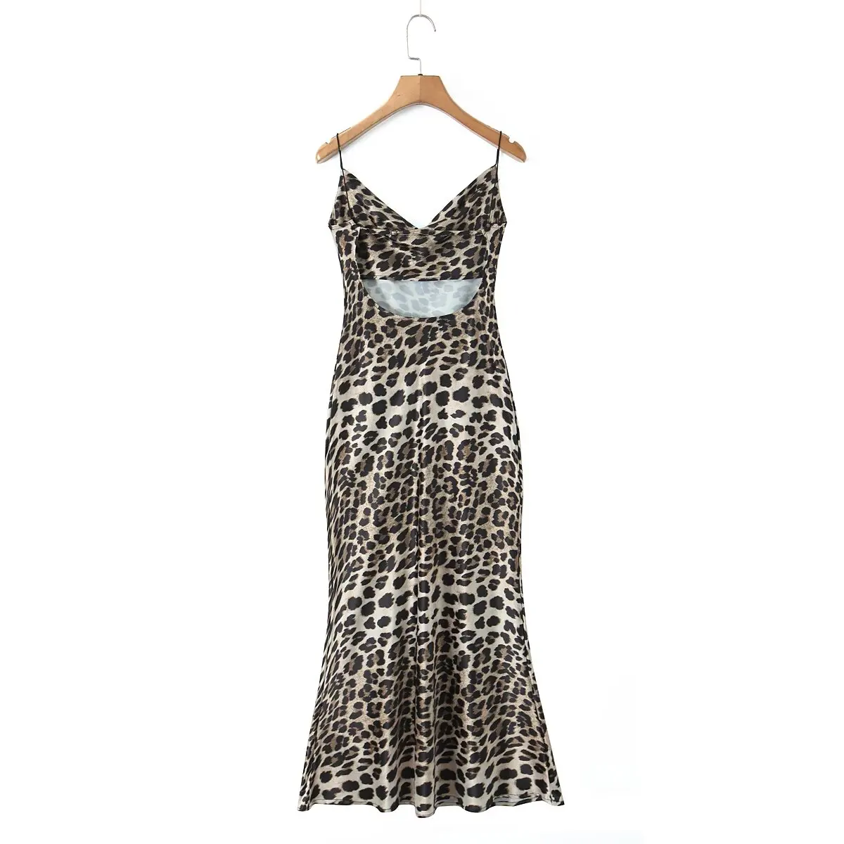 Women Sexy Backless Leopard Print Sling Dresses Fashion Swinging Collar Night Out Party Dresses Midi Long Robe