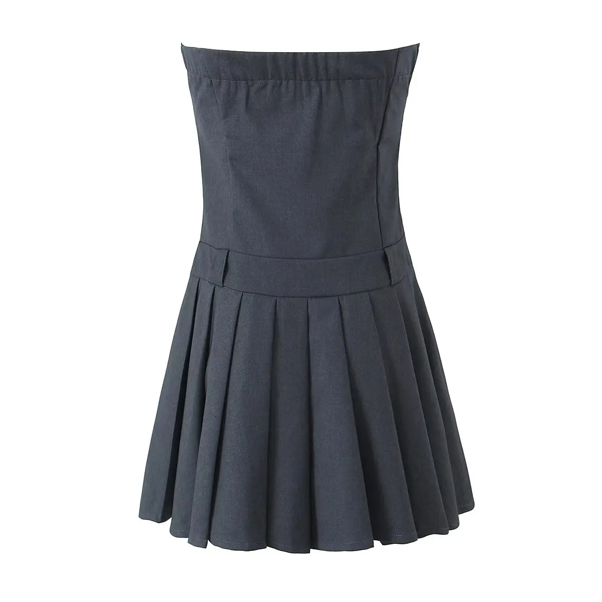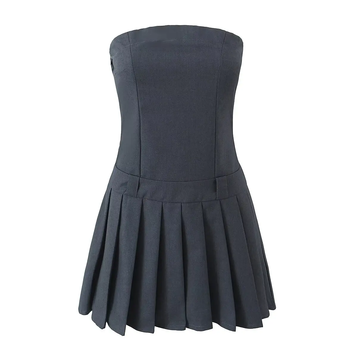New 2024 Women Sexy Strapless Mini Dress Slim Low Waist Pleated Hem A-line Party Robe