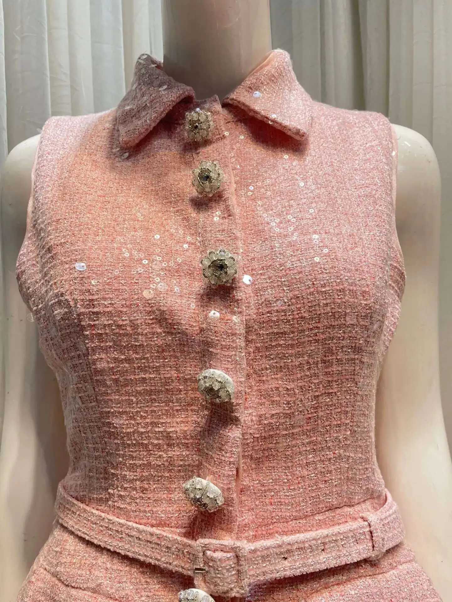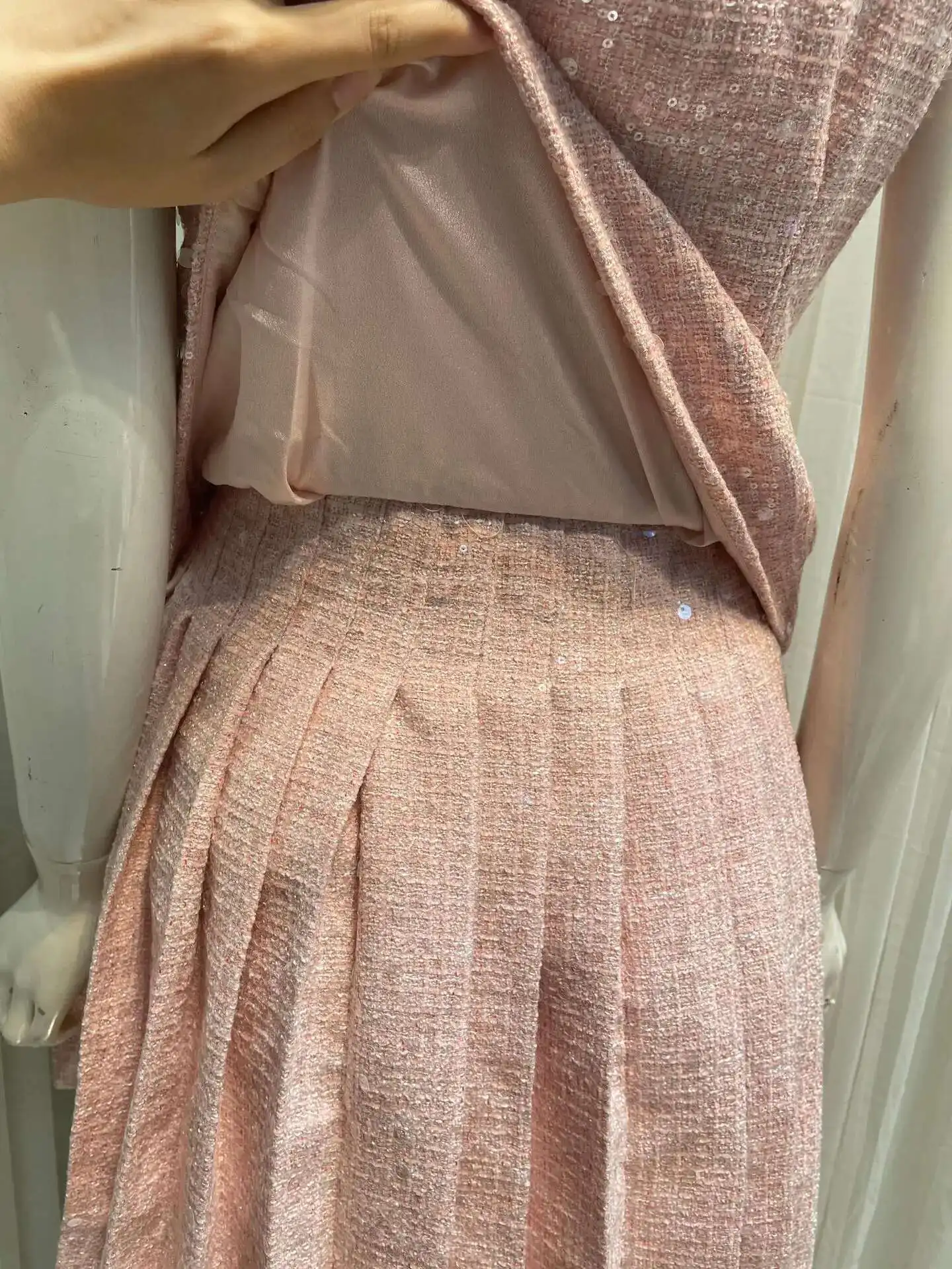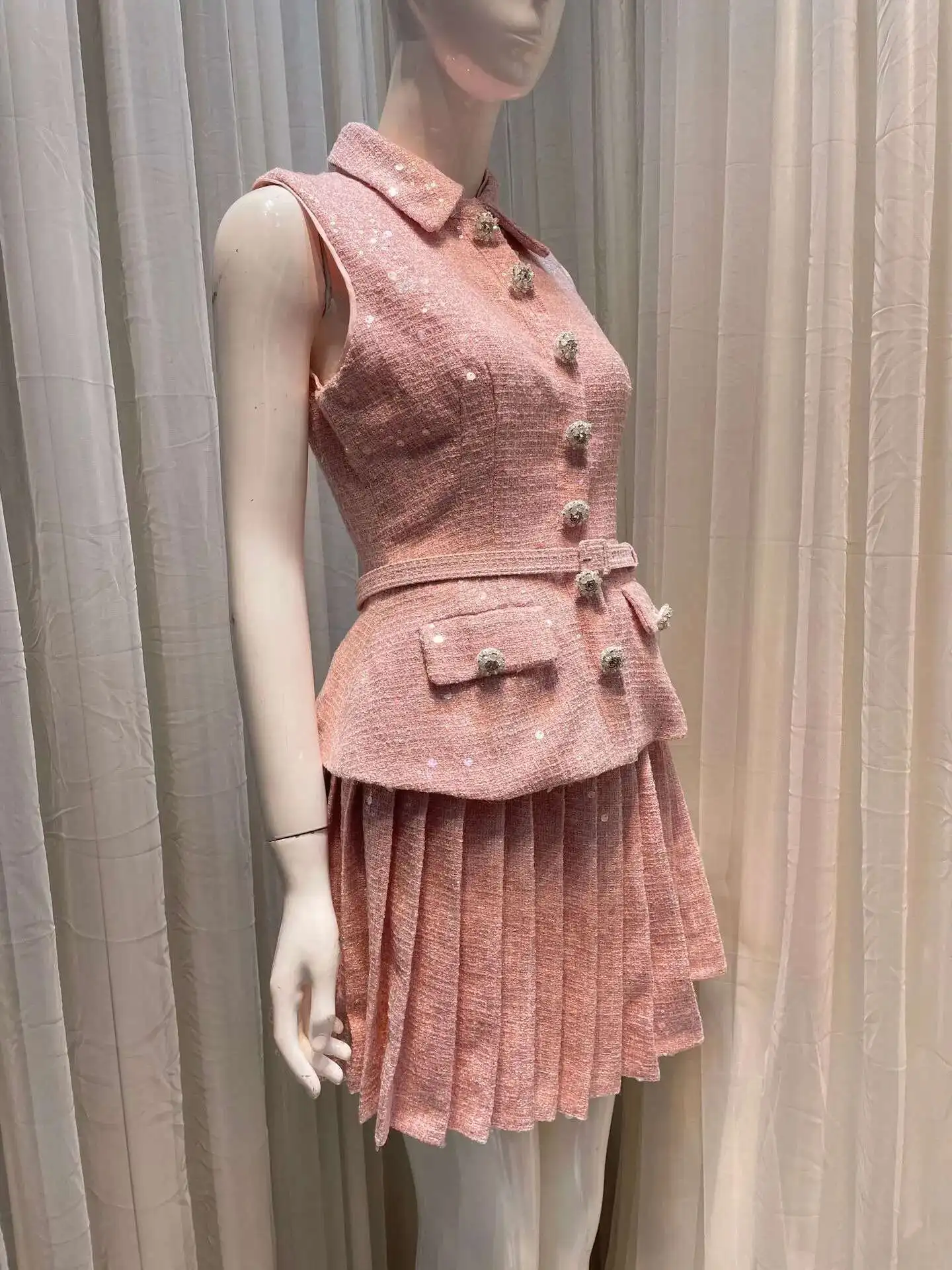 Women's Tweed Sequins Spliced 2 Pcs Set Lapel Lace-up Sleeveless Belt Coat Pleated Mini Skirts Set 2025 New Tide
