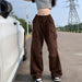 Y2K Brown Drawstring Cargo Pants Women Vintage Hip Hop Streetwear Baggy Pocket Wide Leg Trousers Summer Casual Straight Pants