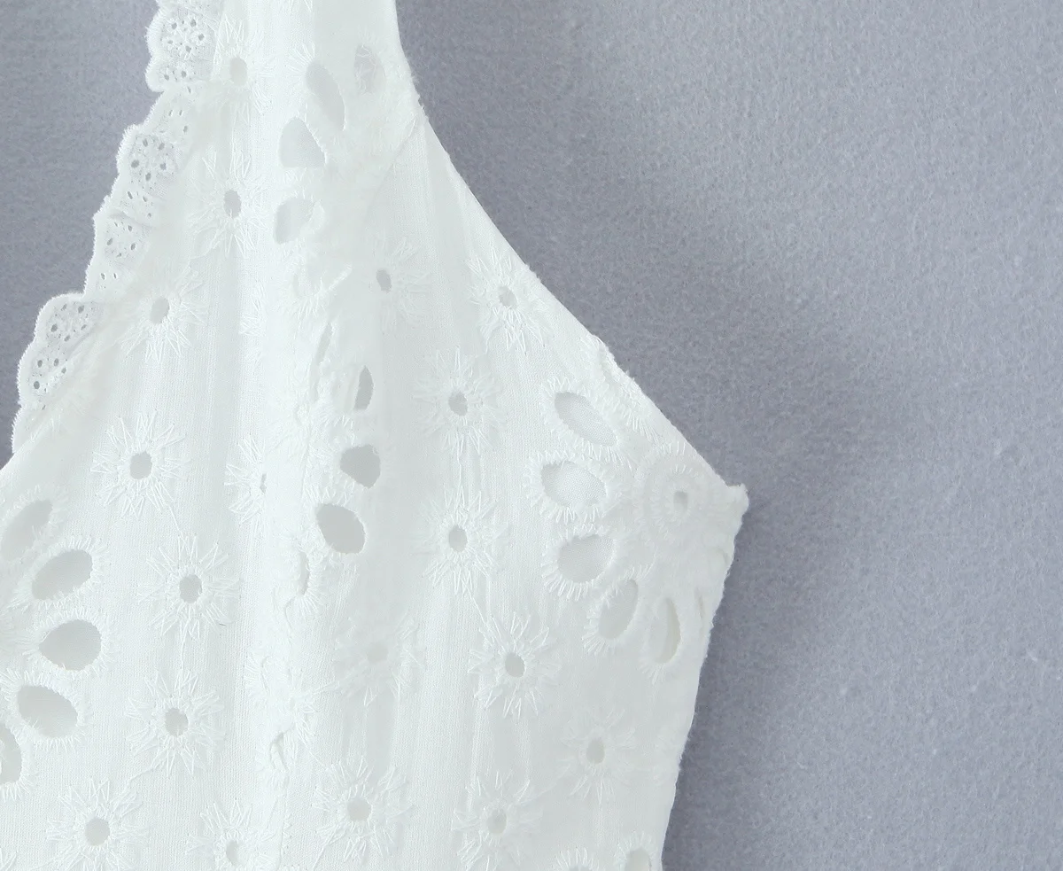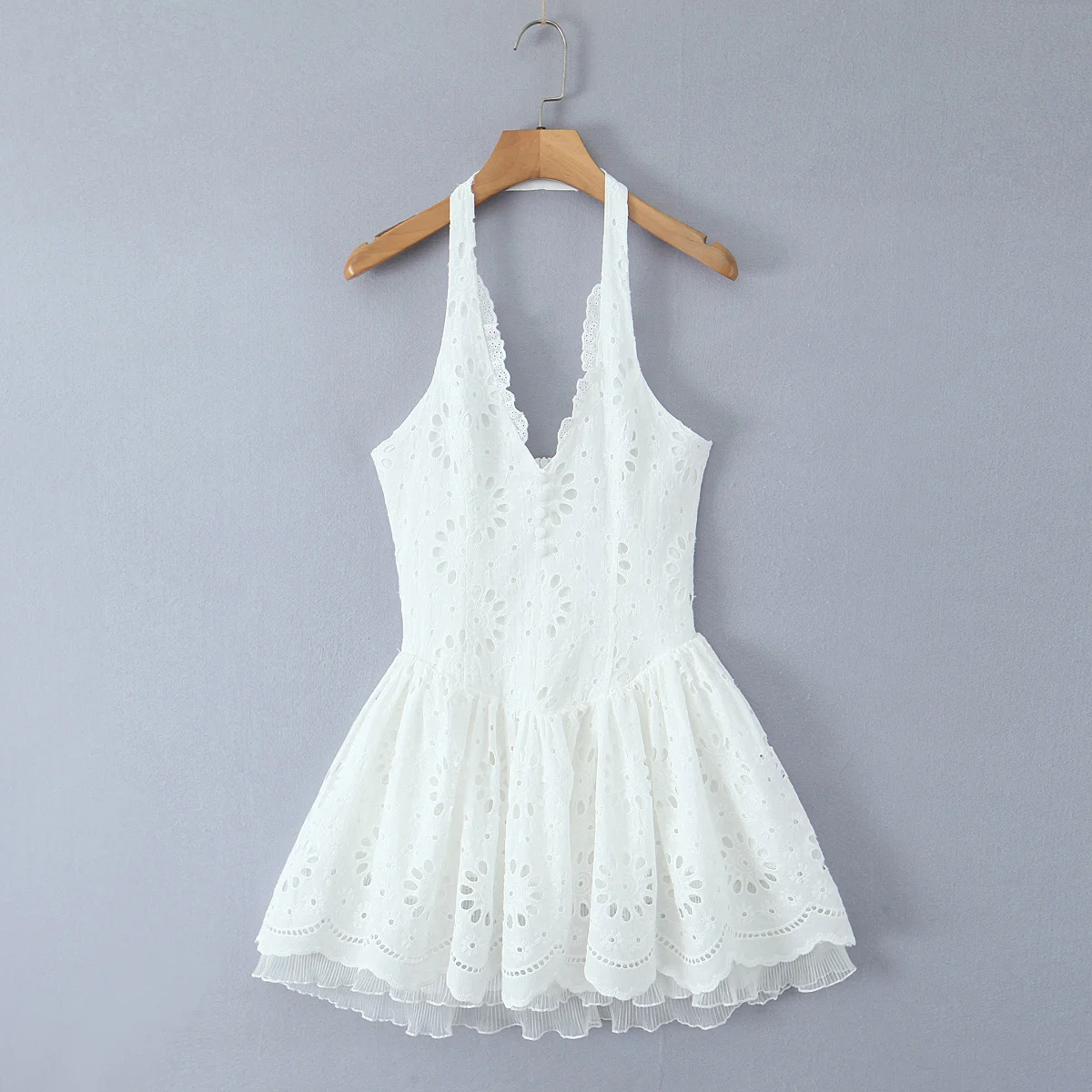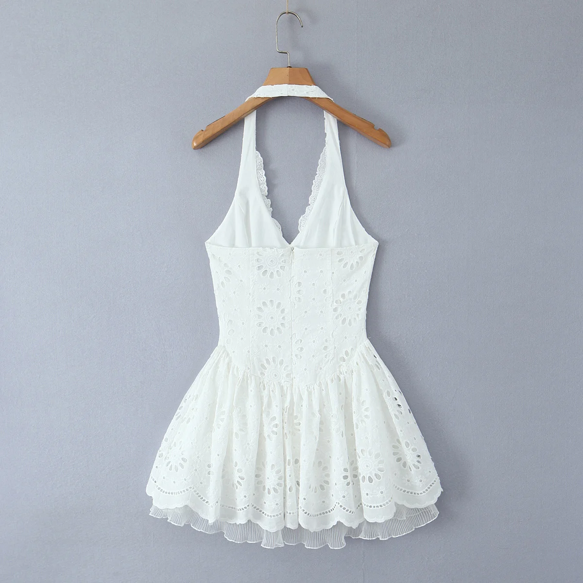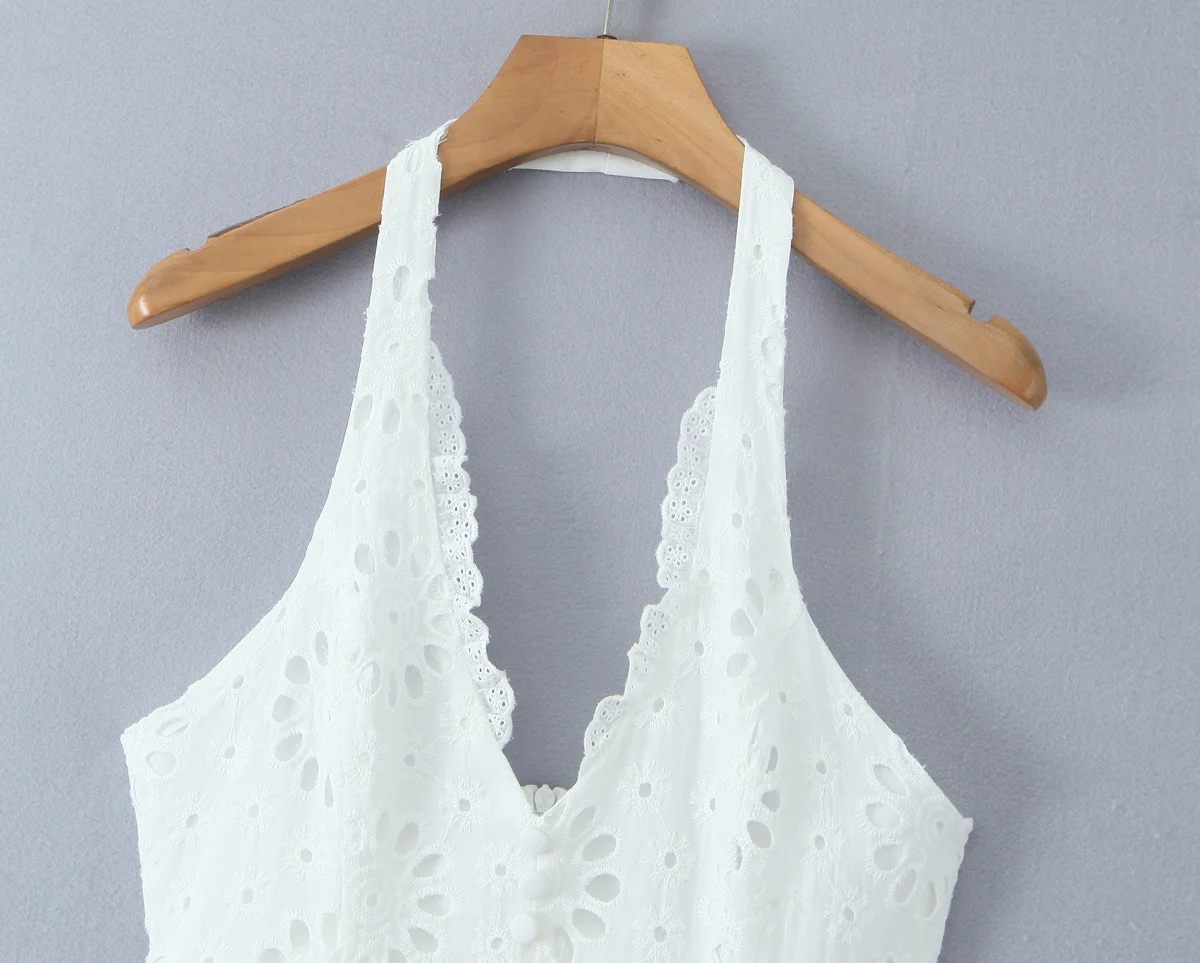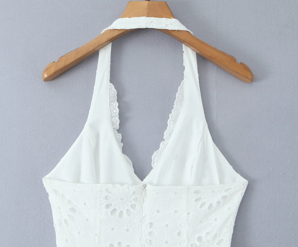 French Style Sexy Backless Halter Dress For Women Hollow Out Embroidery White
