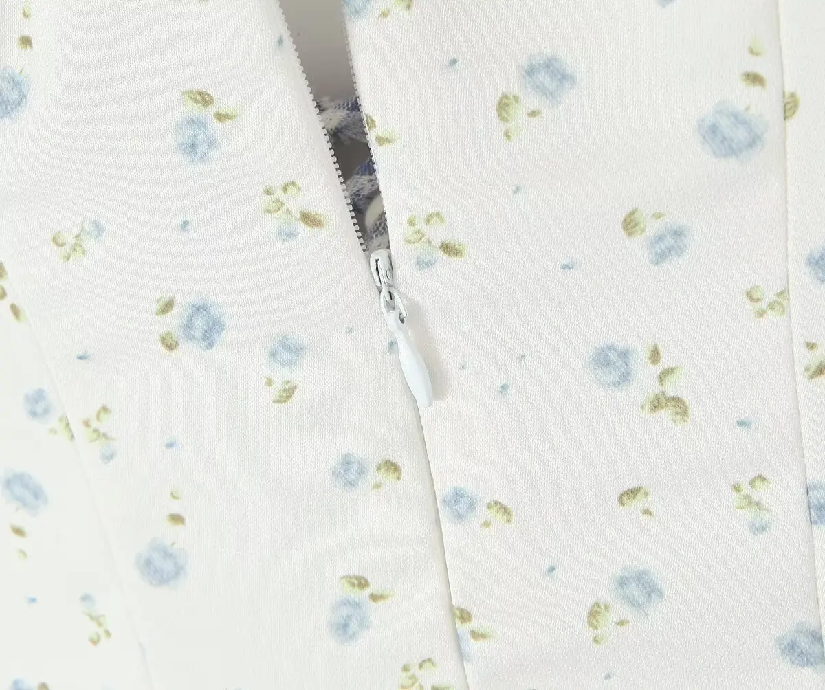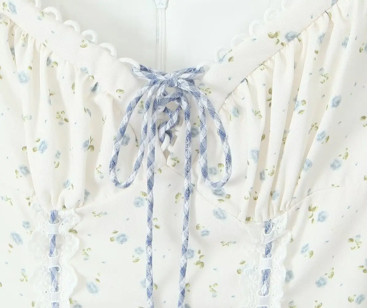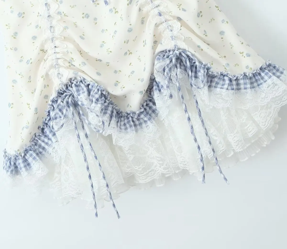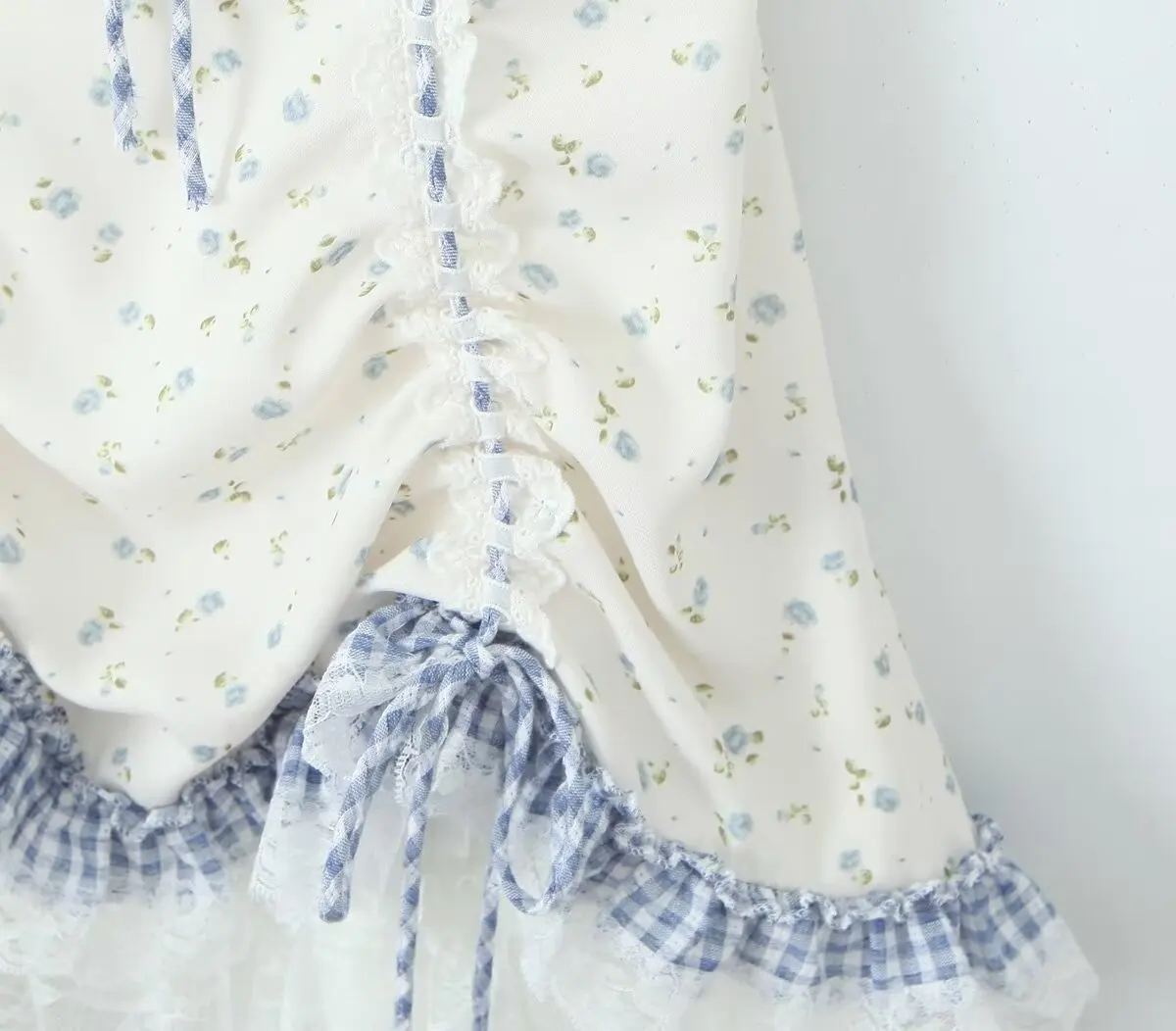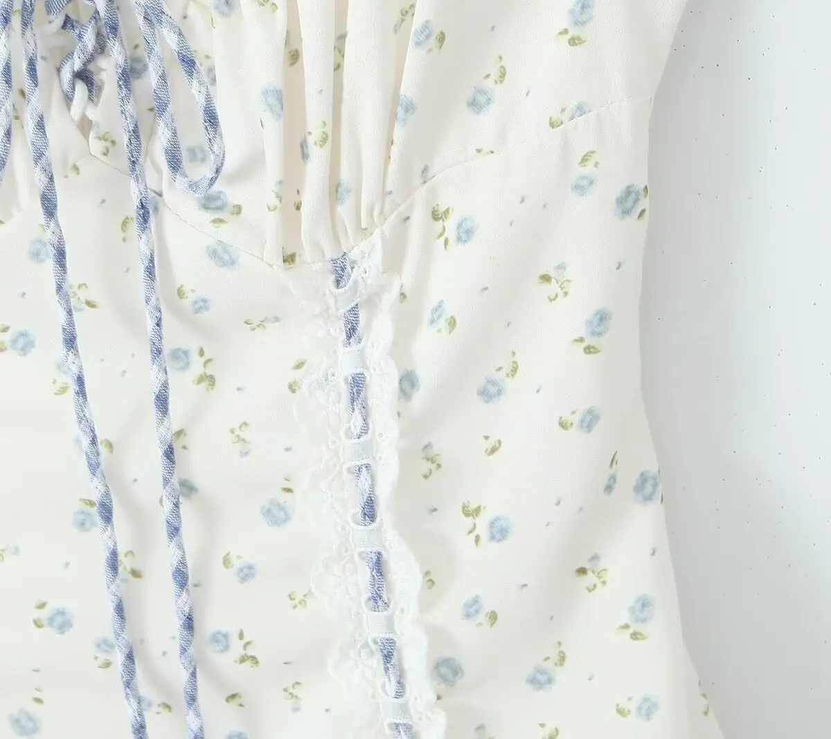 High Quality Women Vintage Drawstring Lace Trim Floral Print Mini Dress