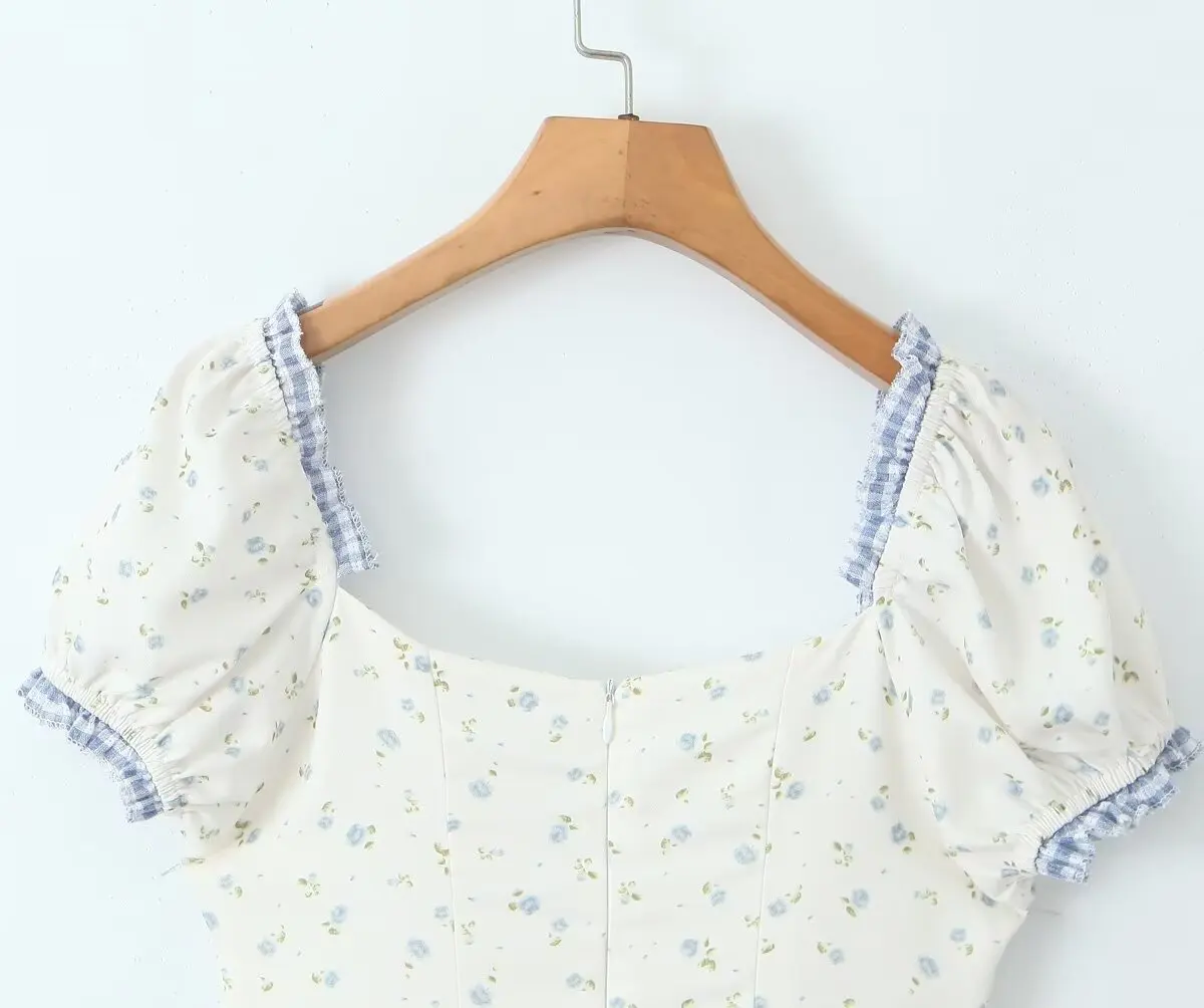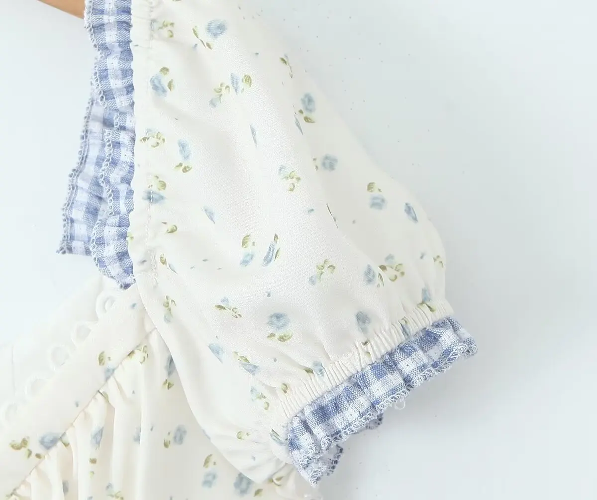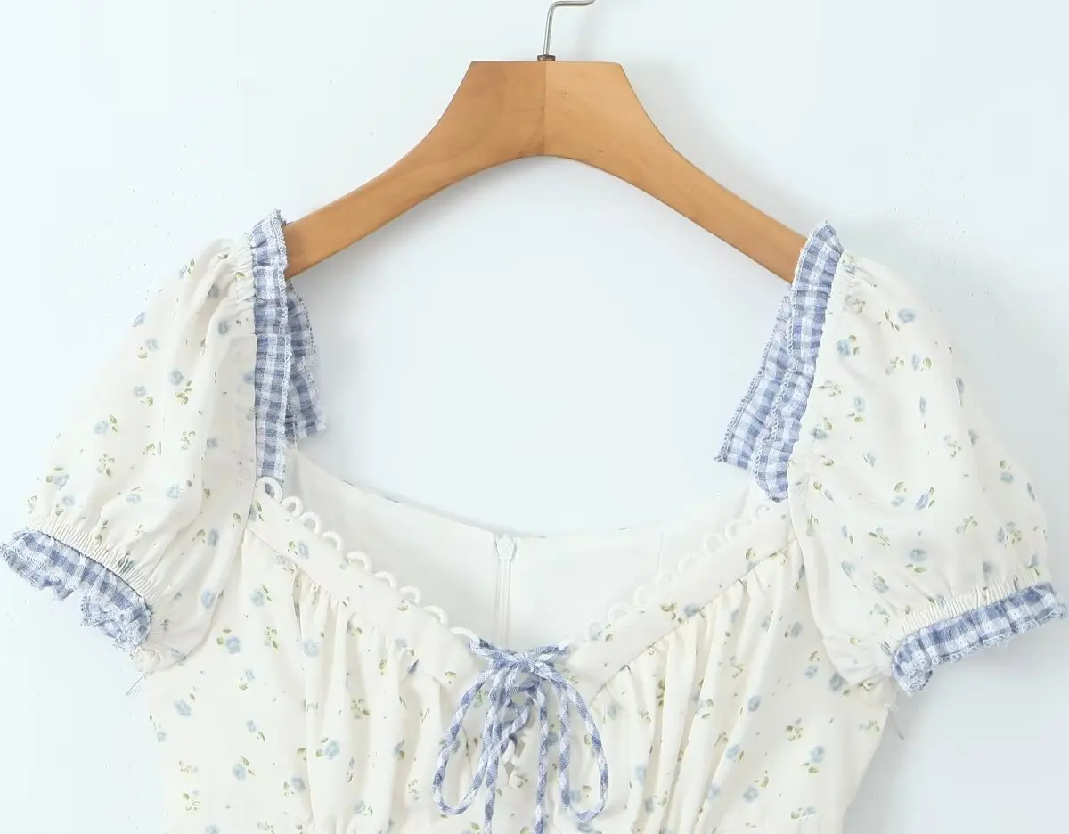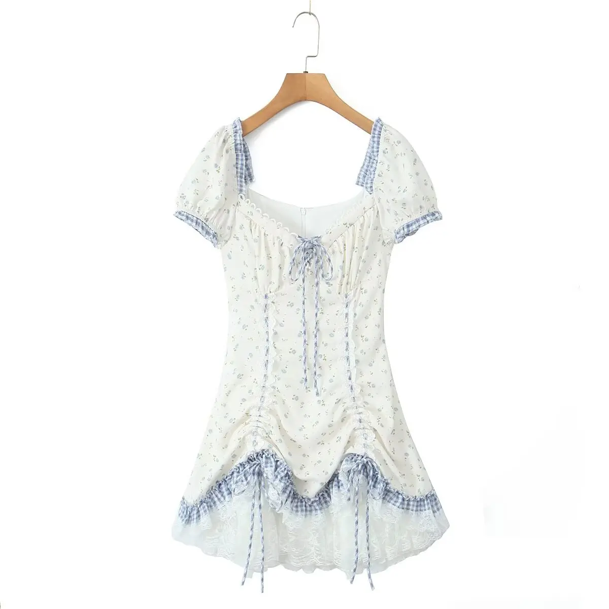 High Quality Women Vintage Drawstring Lace Trim Floral Print Mini Dress Puff Sleeve Ruffle