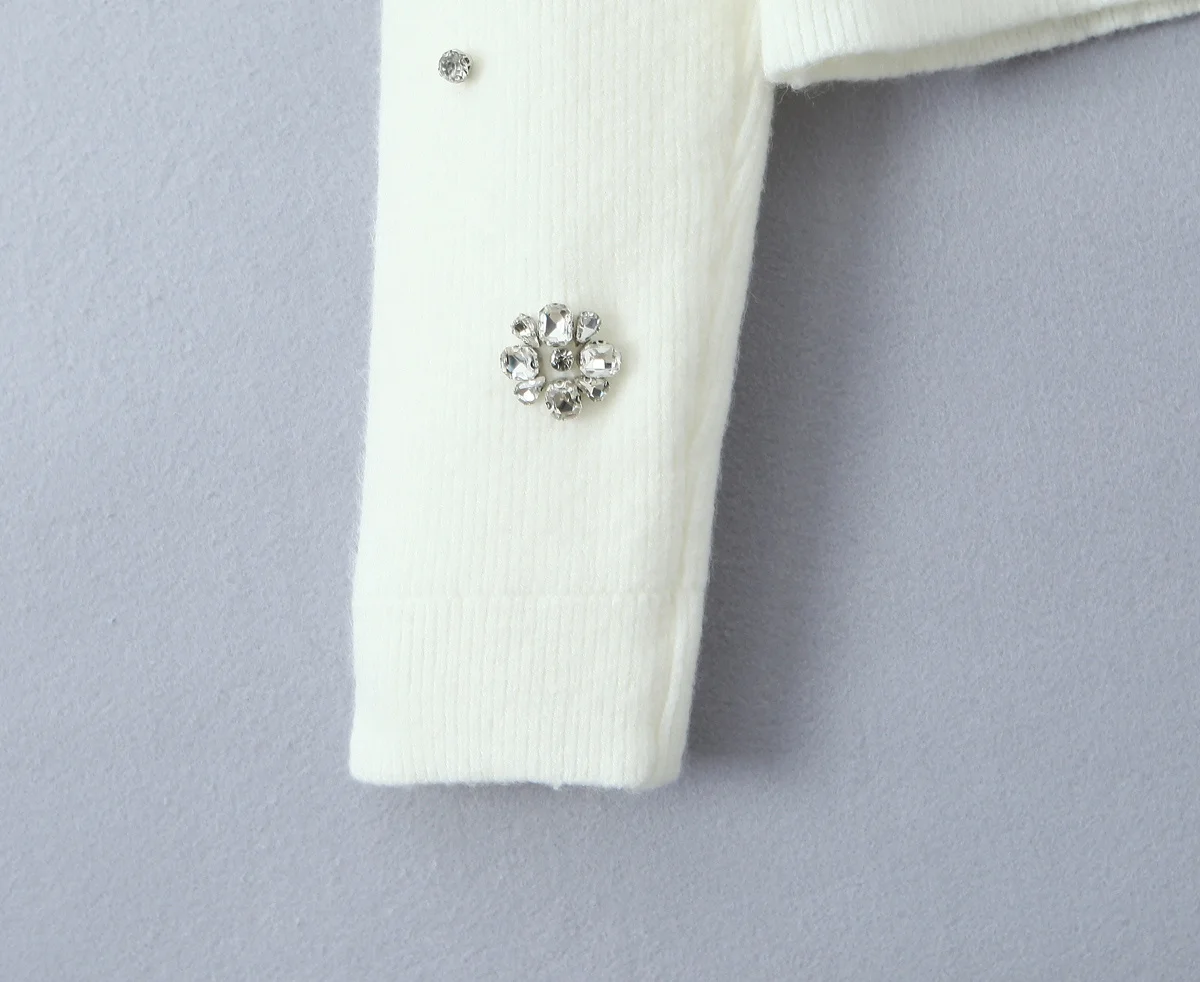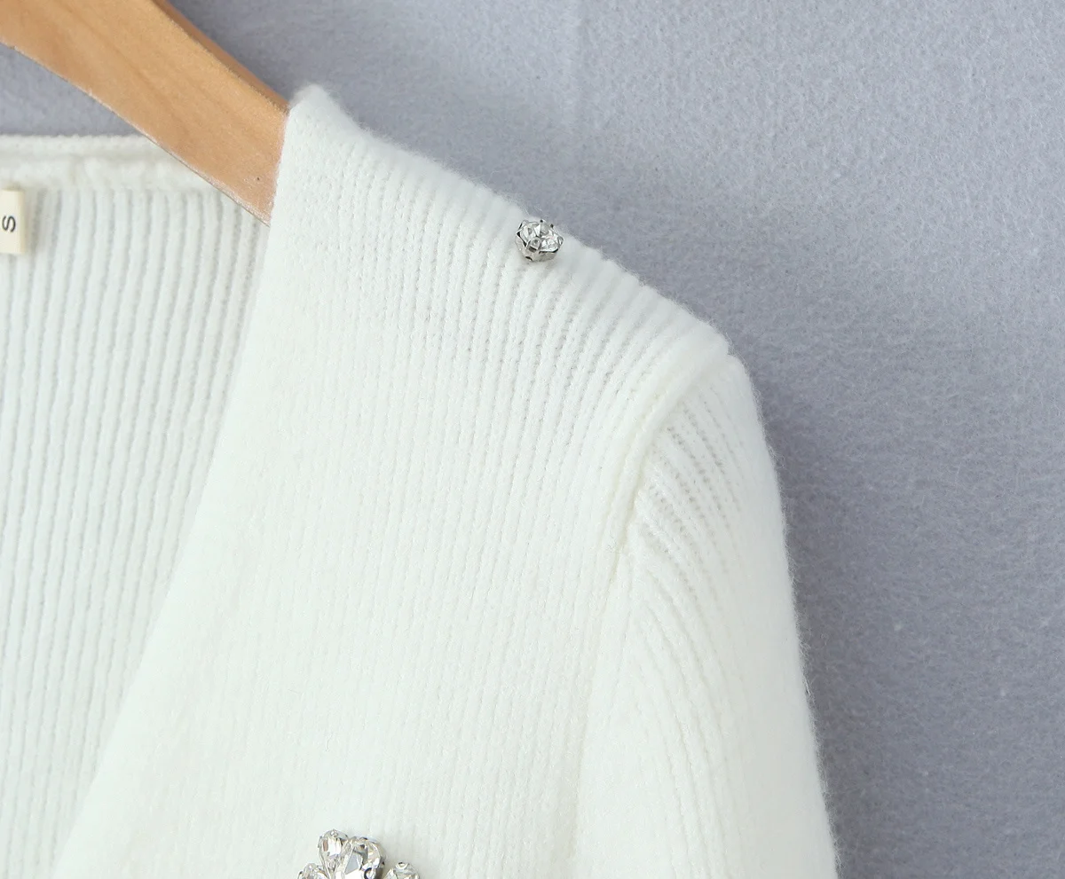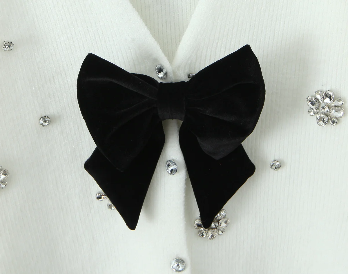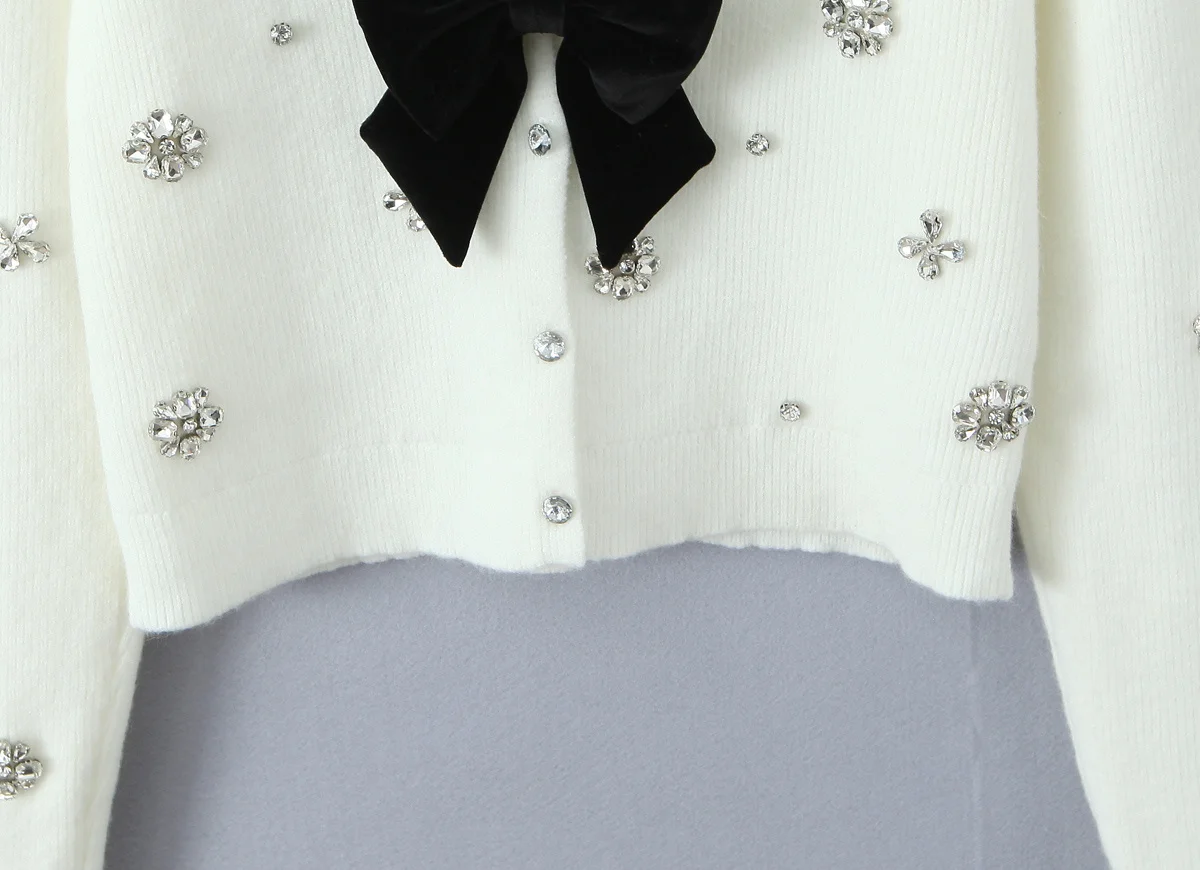 New Women Fashion Handmade Diamond Bow Knit Cardigan Long Sleeve V Neck Slim Crop Sweater Elegant Coat Tops