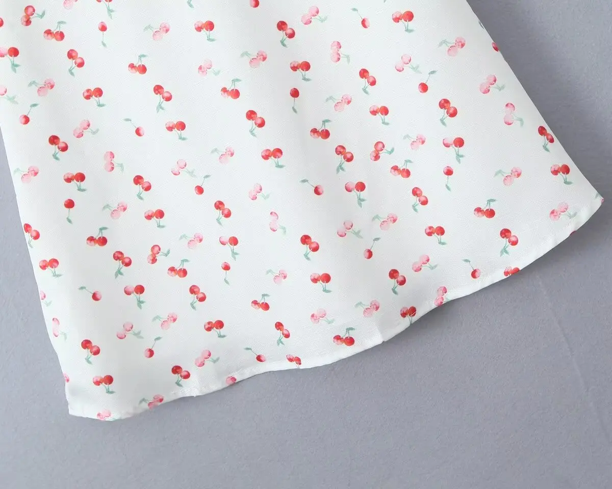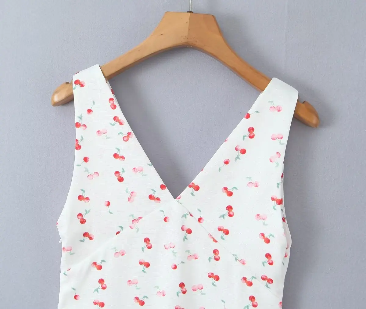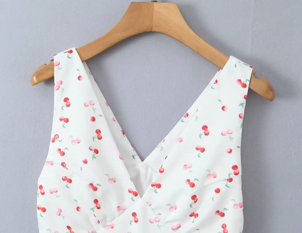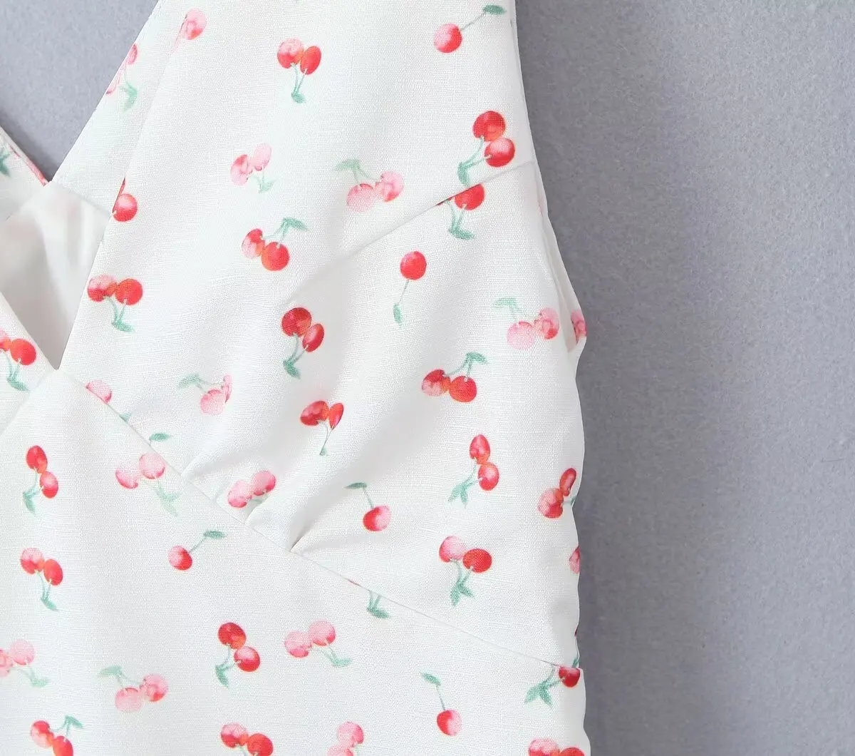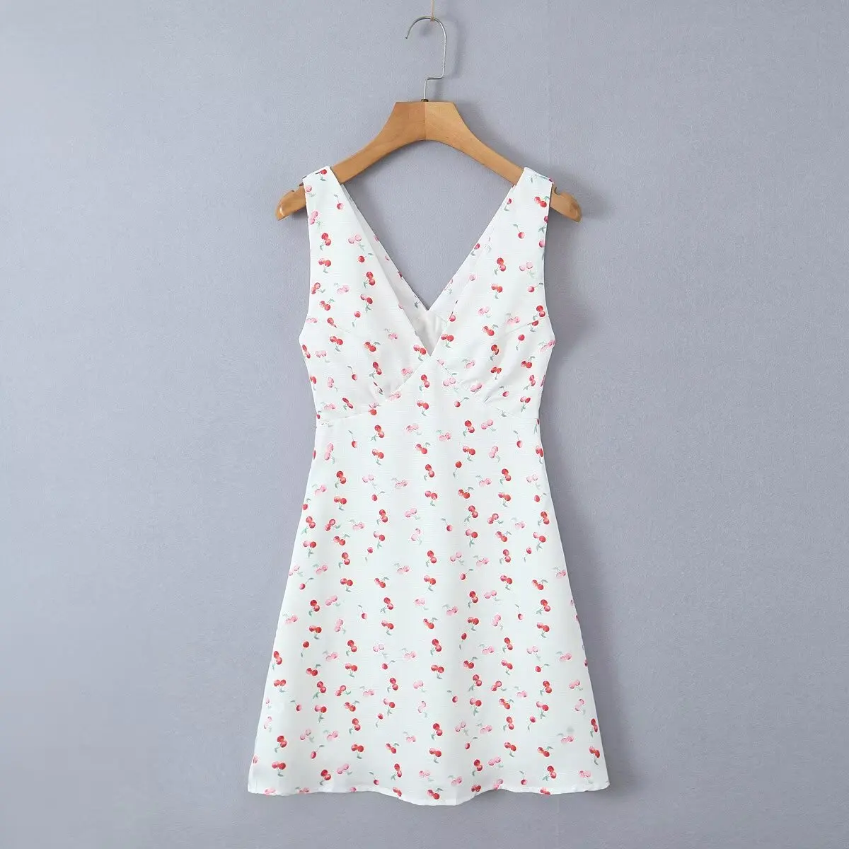 Summer Women Sexy Backless Cherry Printed Tank Dress Sleeveless V Neck A-line Holiday Short Dresses French Style Robe