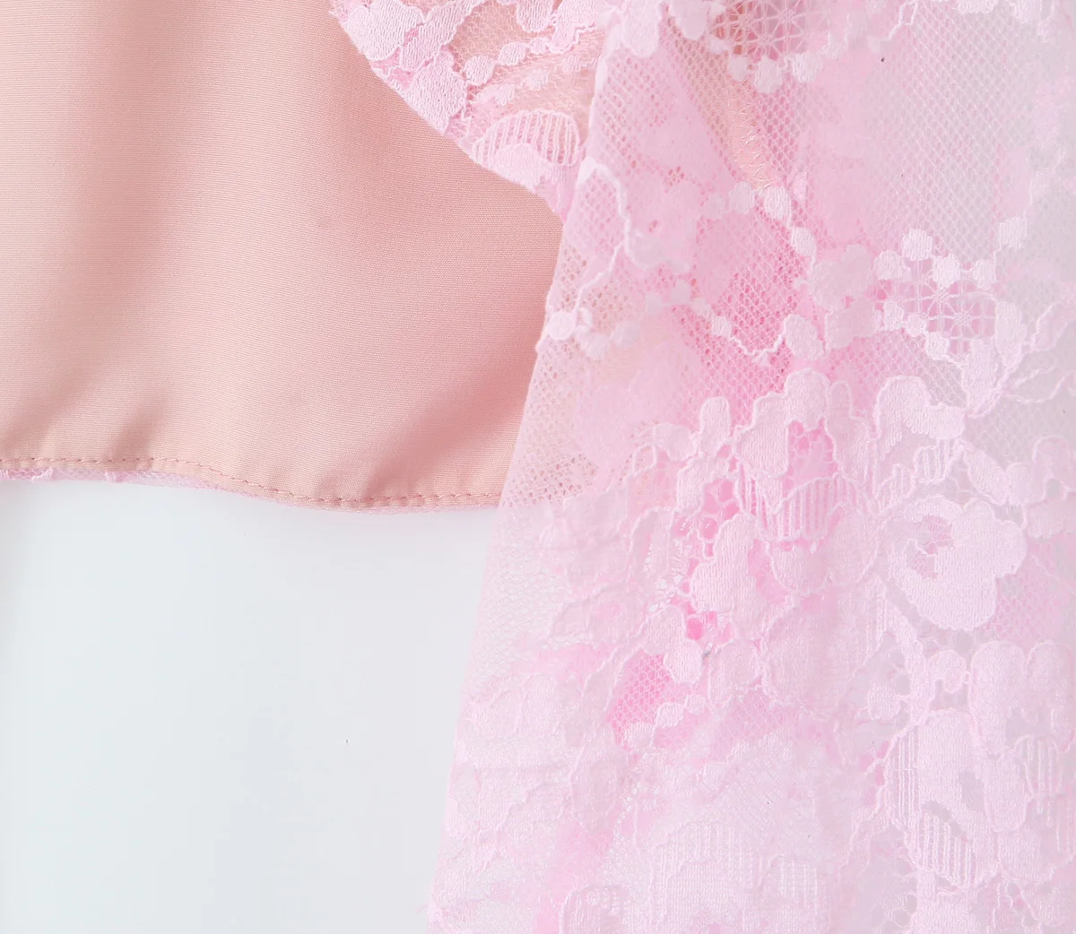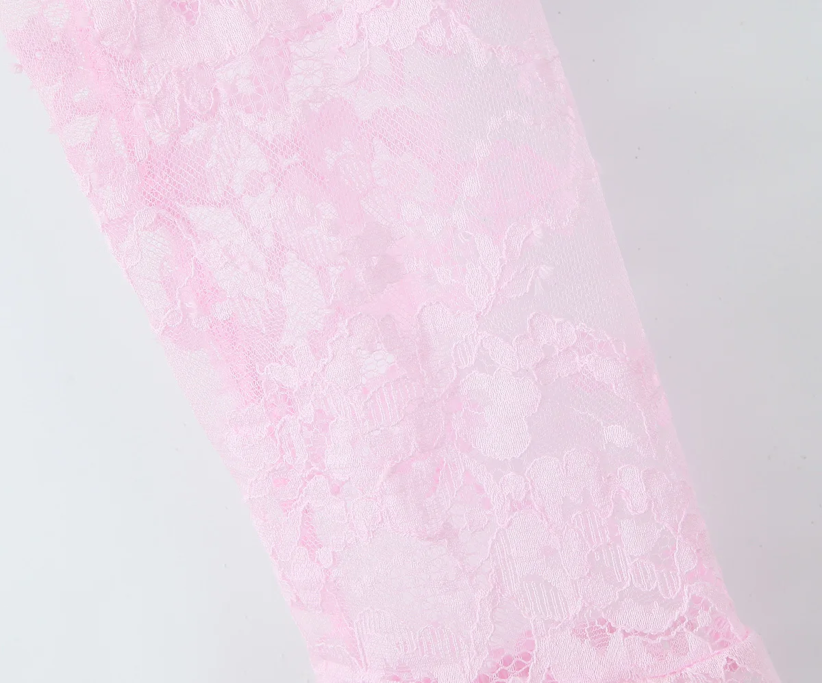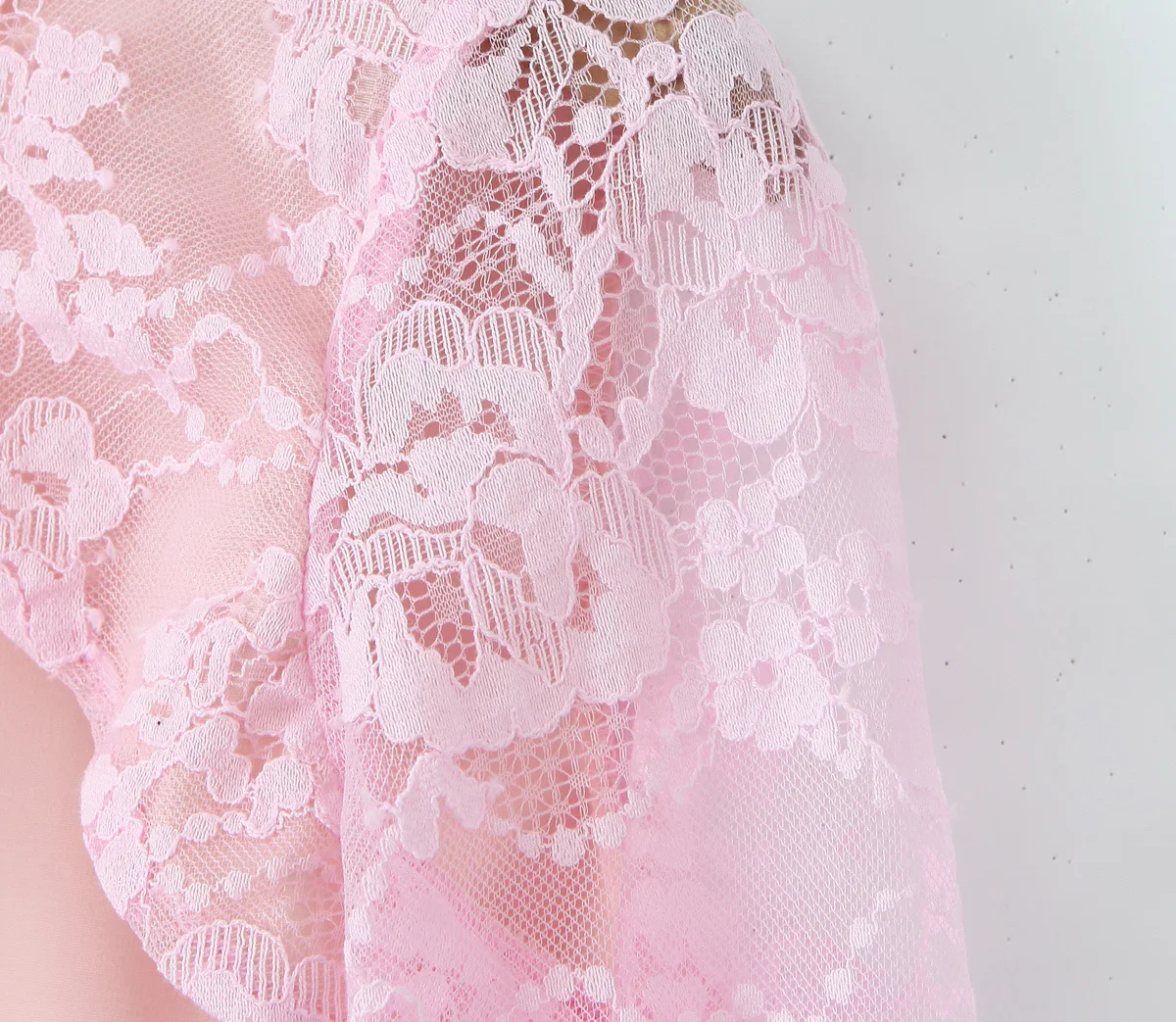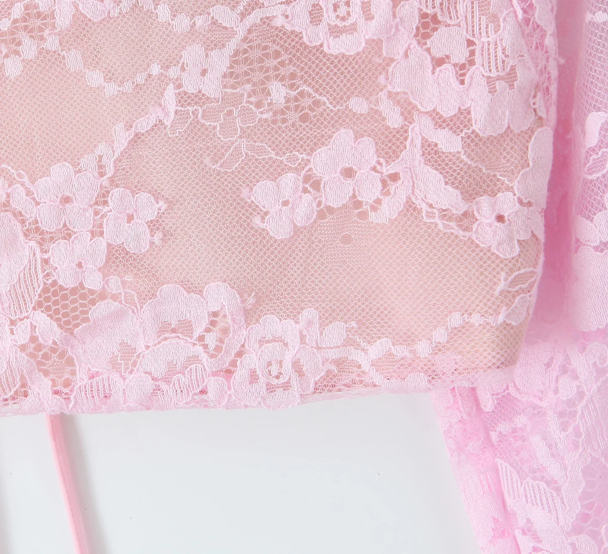 Women Sexy Elegant 2pcs Pink Lace Dresses Thin Straps + Long Sleeve Crop Top