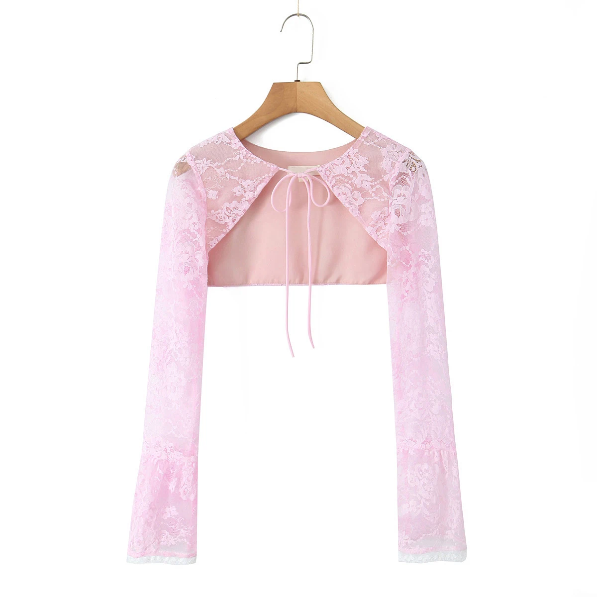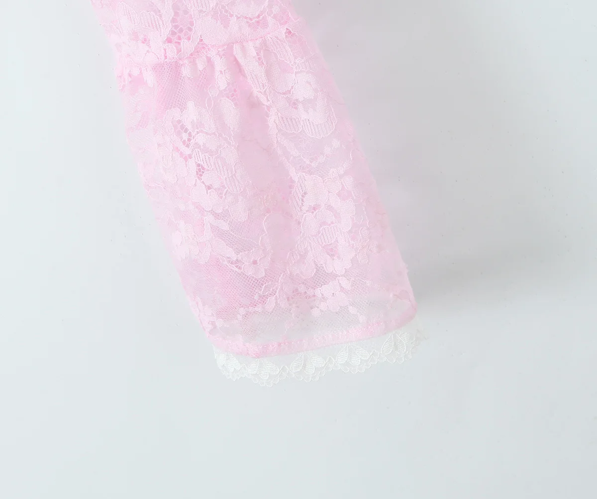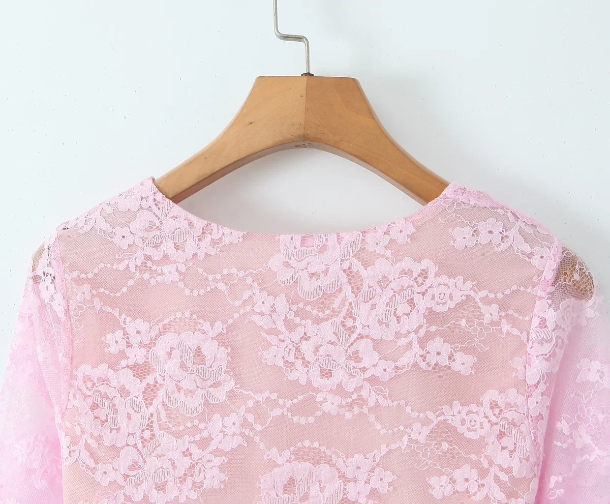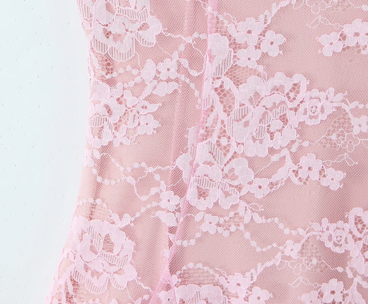 Women Sexy Elegant 2pcs Pink Lace Dresses Thin Straps + Long Sleeve Crop Top