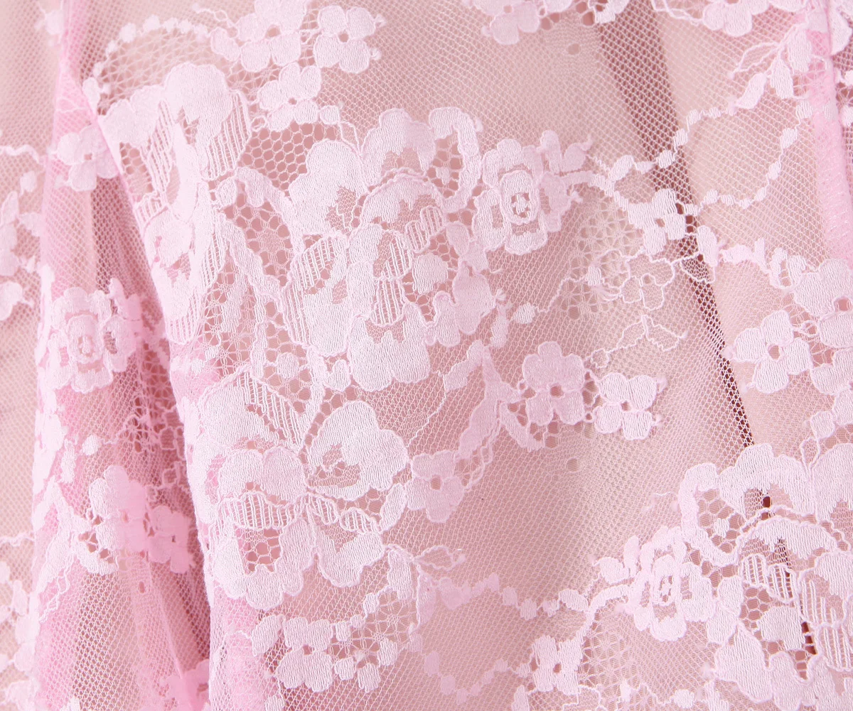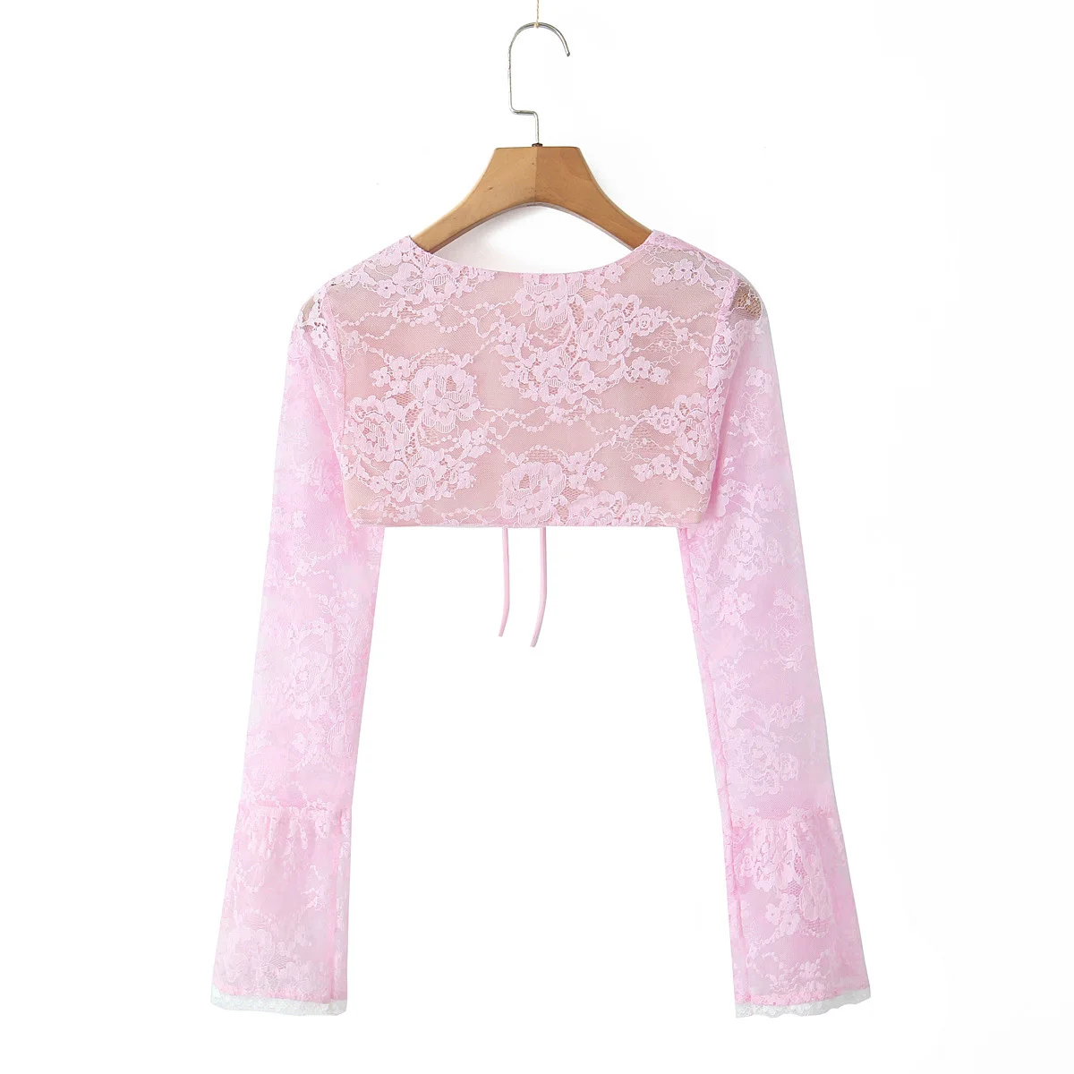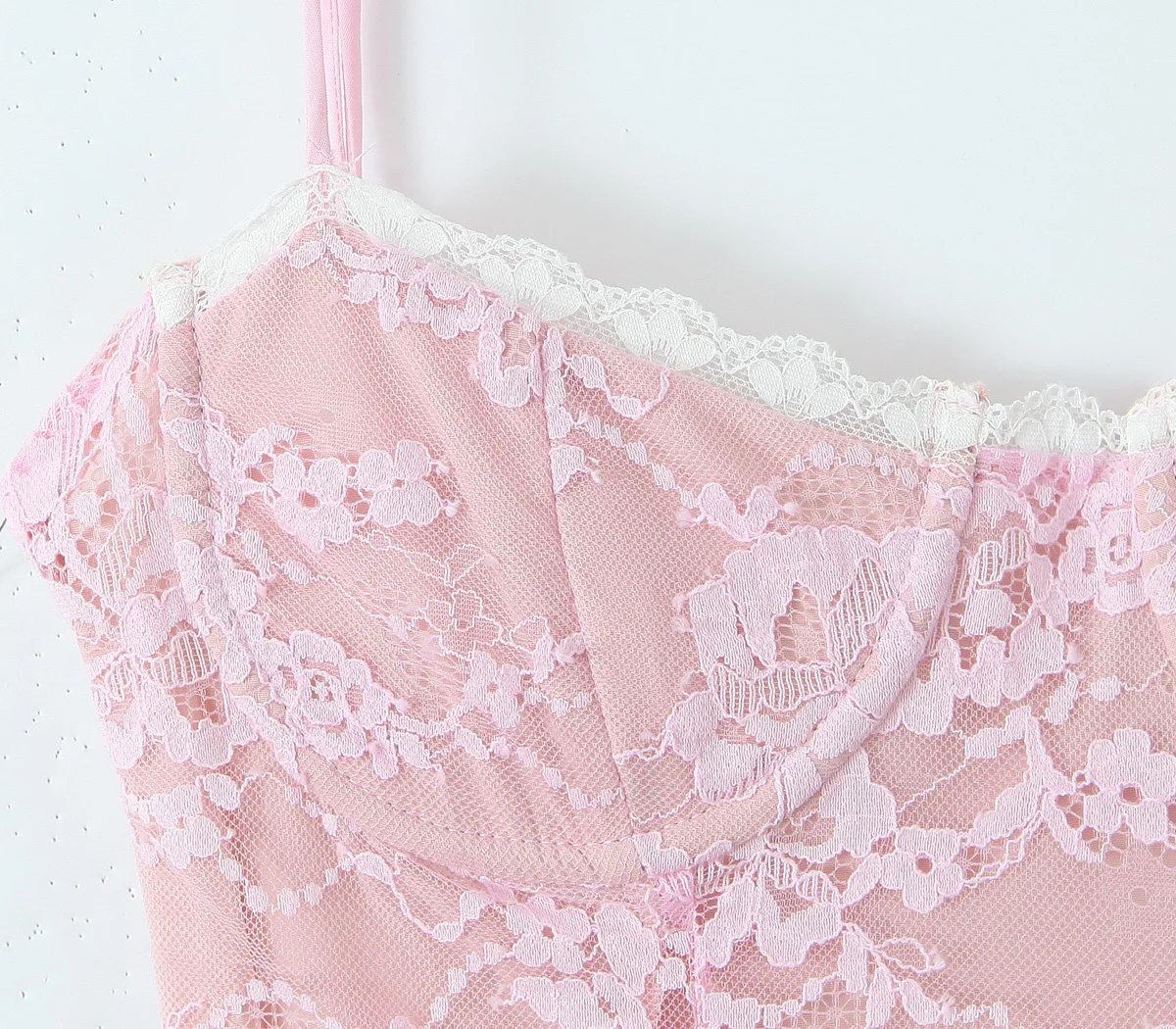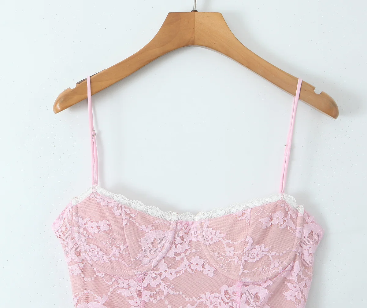 Women Sexy Elegant 2pcs Pink Lace Dresses Thin Straps + Long Sleeve Crop Top