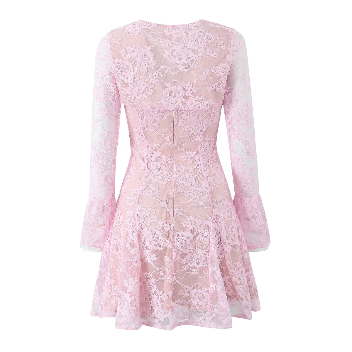 Women Sexy Elegant 2pcs Pink Lace Dresses Thin Straps + Long Sleeve Crop Top Christmas Party Mini Dress Birthday Robe